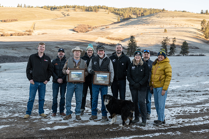 Representatives of the Montana Natural Resources Conservation Service and Five Valleys Land Trust with Dean Indreland (holding plaque, left), Rory Indreland (holding plaque, right) celebrate the project | Photo: Anastasia Wilde