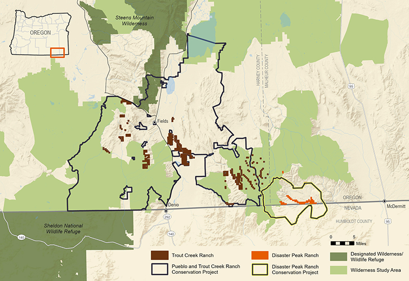 - Conserve Fish & Wildlife Habitat: The ranch falls directly within Oregon Department of Fish and Wildlife-identified Priority Wildlife Connectivity Areas. Lahontan cutthroat recovery efforts have been deemed imperative by the U.S. Fish and Wildlife Service and the area is home to some of the highest densities of greater sage-grouse in the U.S. Conservation also benefits the Columbia spotted frog, pygmy rabbit, California bighorn sheep and many other high desert species.