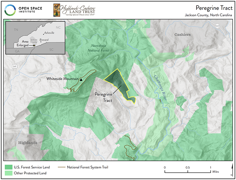 As a Natural Heritage Area, Peregrine Preserve contains high and low elevation granitic domes that support rare species, including green salamanders, granite dome goldenrod, timber rattlers and Blue Ridge groundsel. Conservation of the property will also provide a greater buffer to the adjacent old-growth management area within the Nantahala National Forest and the nearby peregrine falcon eyries on the southeast face of Whiteside Mountain.